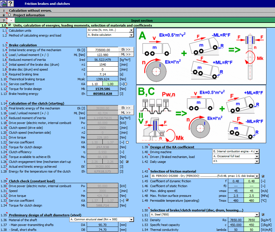 Design, calculation and validation of four basic types of friction brakes and clutches. Calculation of the kinetic energy and loading moments of the mechanisms.
